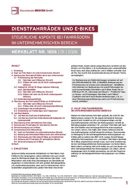 Das DWS-Merkblatt stellt die Rechtslage ab 2020 dar. Die Neuerungen durch das BMF-Schreiben vom 11.11.2025 sind berücksichtigt. Vom Erwerb, über die Nutzung des Fahrrades/E-Bikes durch den Unternehmer, die Überlassung an Arbeitnehmer, die Nutzung für betriebliche Fahrten bis hin zur Stromversorgung werden steuerlich relevante Aspekte von Dienstfahrrädern und E-Bikes im unternehmerischen Bereich beleuchtet.