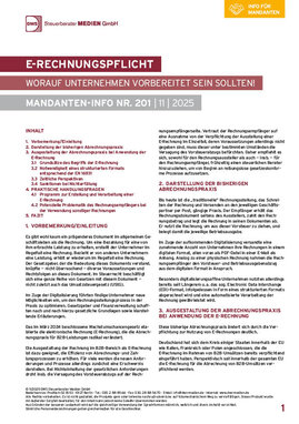 Die aktualisierte Mandanten-Info berücksichtigt die aktuellen BMF-Schreiben sowie die vom BMF veröffentlichten FAQ zur Einführung der E-Rechnung. Sie enthält erweiterte Ausführungen zu den in der Praxis häufig verwendeten Rechnungsformaten und zur Frage der Risikotragung, wenn eine empfangene Leistung unter Rückgriff auf die Ausnahmen durch den Rechnungsaussteller in Form einer sonstigen Rechnung abgerechnet wurde, aber die Abrechnung in Form einer E-Rechnung geboten gewesen wäre.