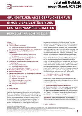 Das Merkblatt erläutert, in welchen Fällen der Immobilieneigentümer aktiv werden und Anzeigepflichten erfüllen muss sowie welche Fristen dafür gelten. Dargestellt wird auch, welche Möglichkeiten es gibt, Fehler in der Feststellungserklärung zu korrigieren und mit welchen Gestaltungen sich die Grundsteuerbelastung für die Zukunft insgesamt senken lässt.