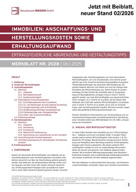 Die Beurteilung von Kosten als Anschaffungs-, Herstellungs- oder Erhaltungsaufwand ist nicht immer ganz eindeutig, gehört aber praktisch zum Tagesgeschäft in Steuerberatungskanzleien. Dieses Merkblatt zeigt allgemein die Abgrenzung zwischen Anschaffungs- und Herstellungskosten einerseits und Erhaltungsaufwand andererseits auf. Dabei wird auf aktuelle Problembereiche, wie beispielsweise die Zuordnung bestimmter öffentlicher Beiträge, die Erhaltungsrücklage, Umrüstungen auf Wärmepumpen oder Blockheizkraftwerken sowie der Ausstattung mit E-Ladestationen eingegangen. Die richtige Zuordnung der Kosten ist für die Höhe der Abschreibungen bzw. der sofort als Werbungskosten oder Betriebsausgaben abziehbaren Kosten äußerst relevant. Insbesondere, wenn größere und umfangreichere Maßnahmen am Gebäude durchgeführt werden, stellt sich die Frage, ob es noch Erhaltungsaufwand und damit sofort abziehbare Werbungskosten oder Betriebsausgaben oder schon Herstellungsaufwand und damit nur abgeschrieben werden darf. Zugleich zeigt dieses Merkblatt Möglichkeiten auf, wie trotz Qualifizierung als Herstellungskosten ein sofortiger Abzug der Kosten und wie trotz Einordnung als Erhaltungsaufwand eine steueroptimale Verteilung der Kosten möglich ist.