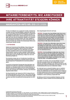 Die Mandanten-Info „Mitarbeiterbenefits“ erläutert, wie Ihre Mandanten als Arbeitgeber durch steuerlich begünstigte Zuwendungen wie Firmenwagen, Gesundheitsvorsorge oder Fahrtkostenzuschüsse bei ihren Beschäftigten punkten können und stellt dar, wie mit maßgeschneiderten Lösungen Lohnsteuer und Sozialabgaben optimiert und gleichzeitig die Mitarbeitermotivation gestärkt werden können.